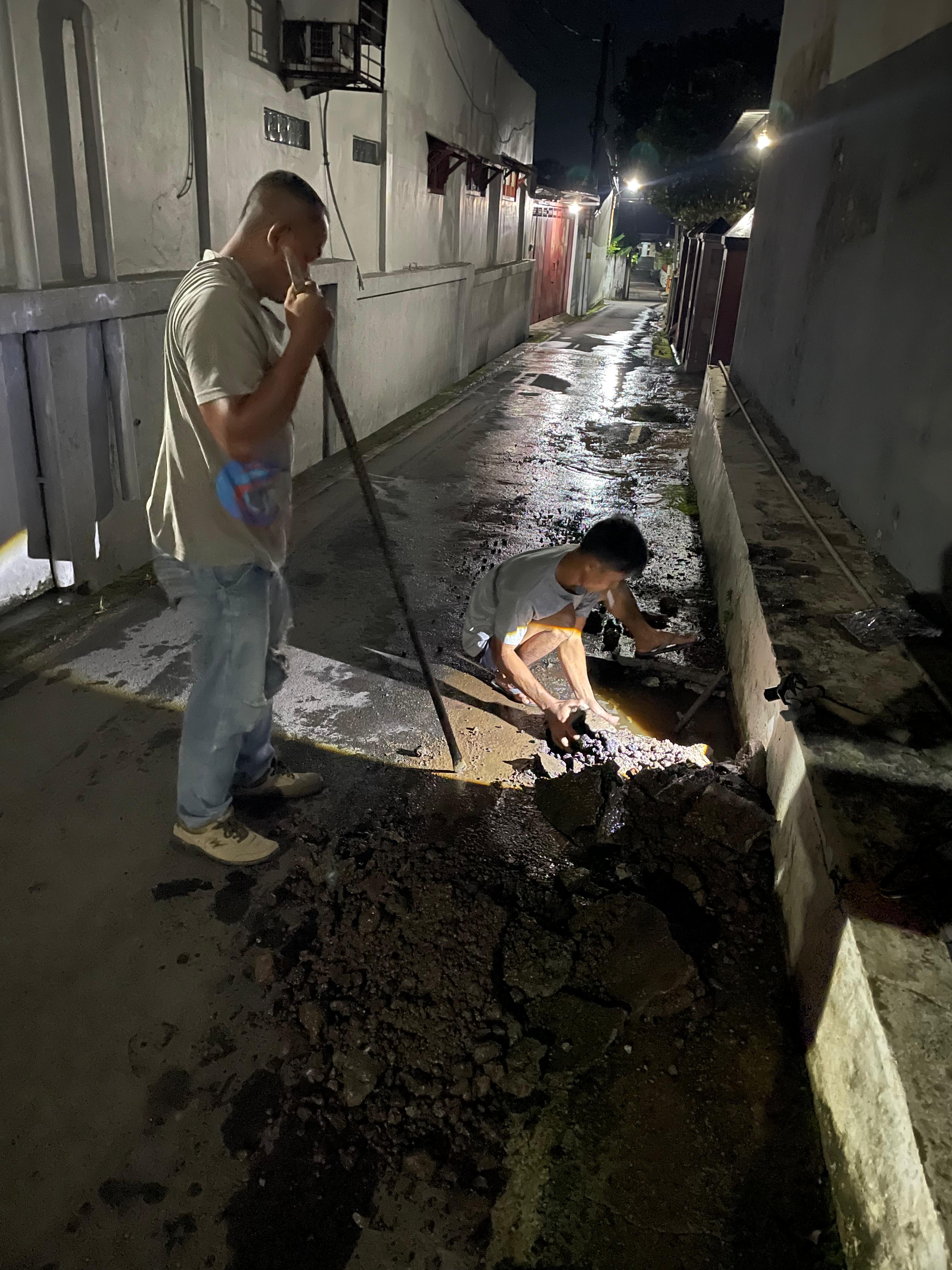 Dengan bantuan lampu penerangan sederhana, mereka mulai menggali aspal dan cor untuk menemukan titik kebocoran. Setelah beberapa waktu, terlihat sambungan pipa yang retak sehingga air keluar cukup deras.
